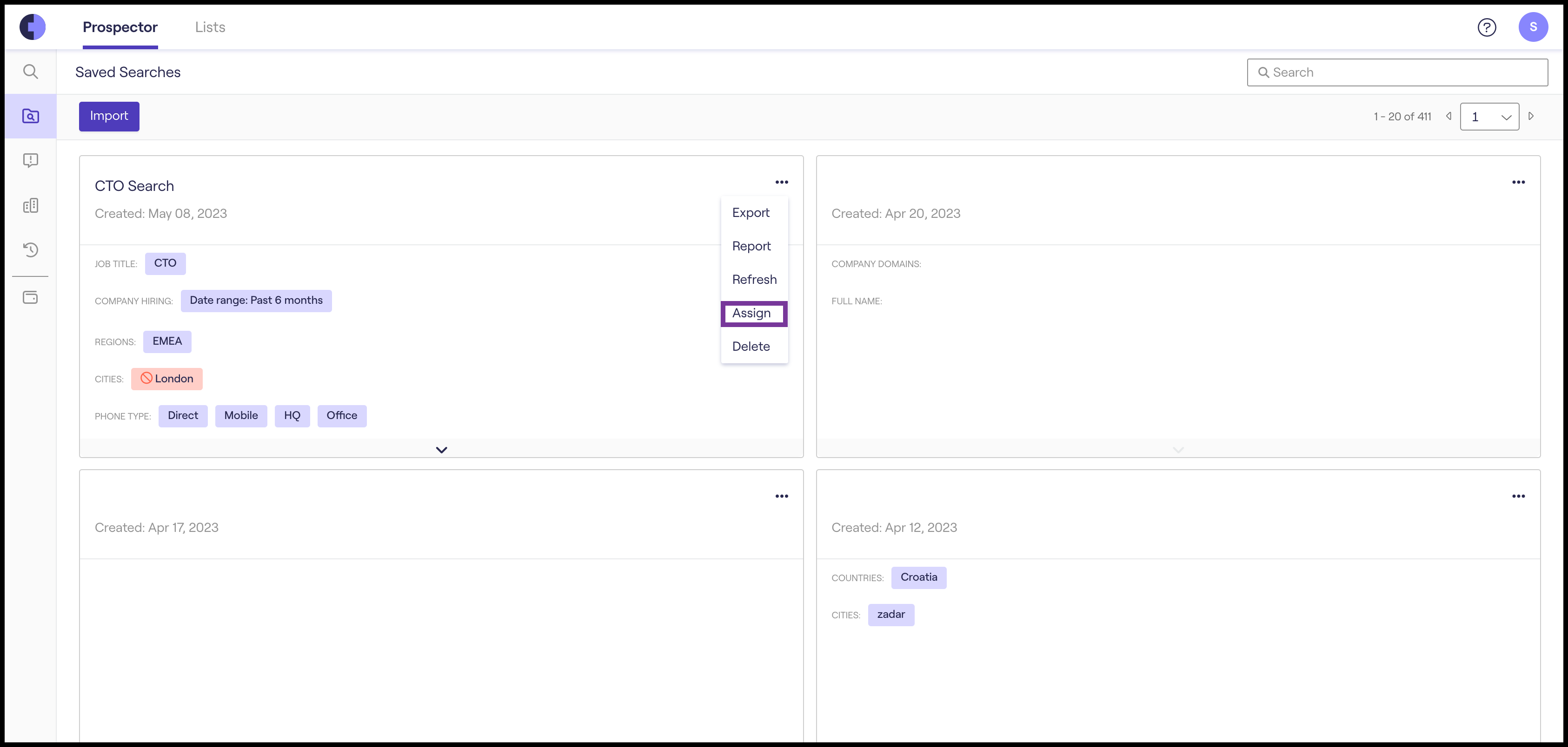 As an Admin user, or Team Lead user, you have the ability to create a search, save it, and assign it to other users or teams within your Cognism account.