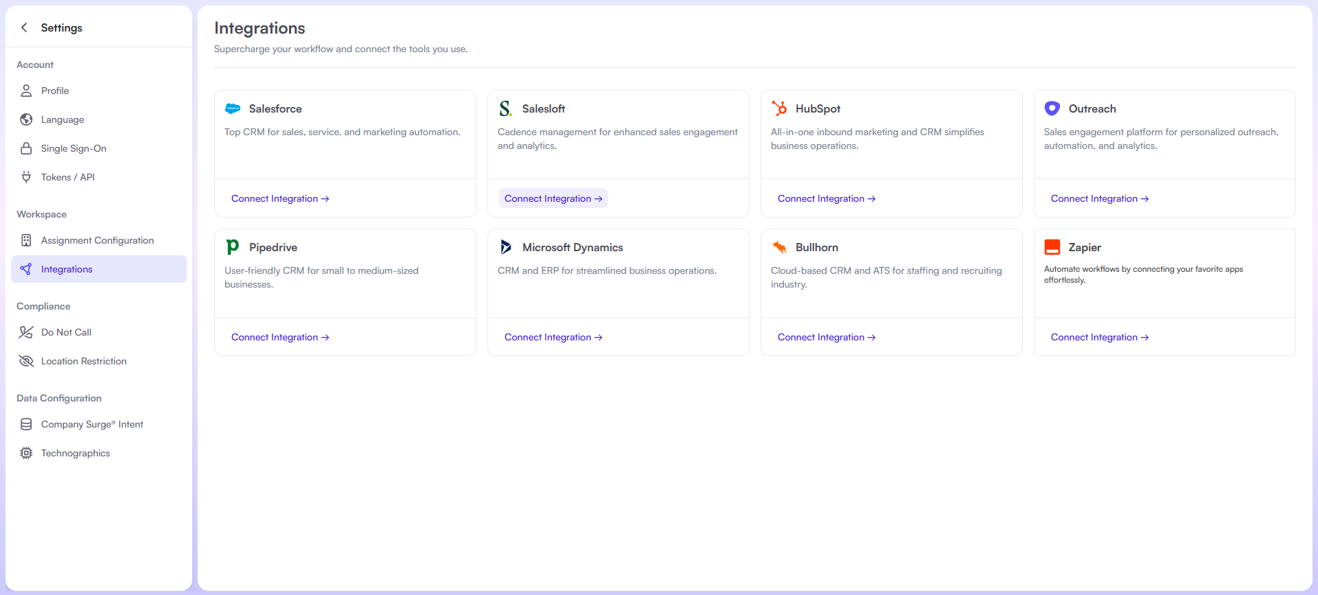 - Select Integrations > Salesloft > Connect Integration