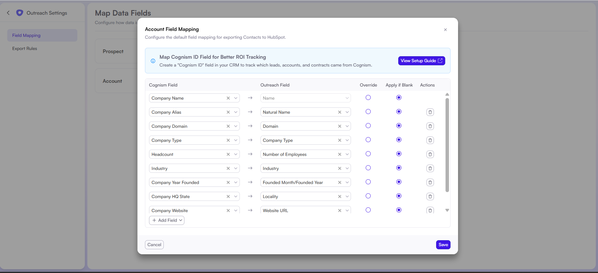 Learn how to set up Outreach field mappings in Cognism to control exports, map data accurately, and manage update behaviour.