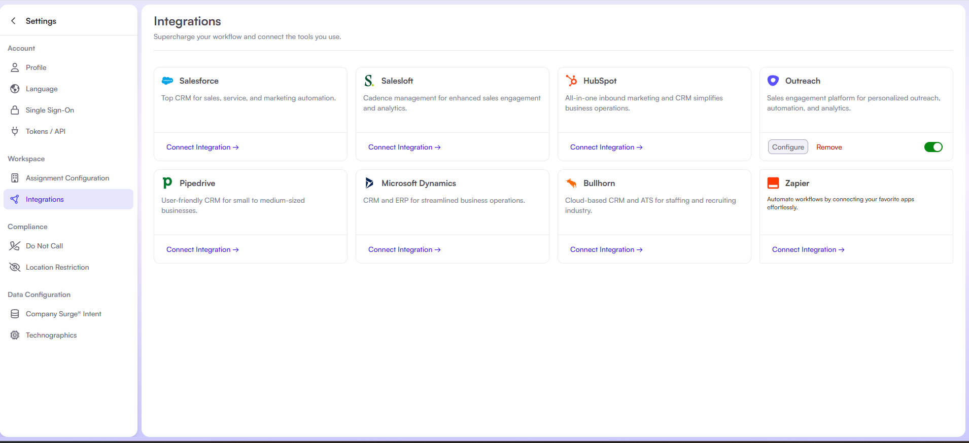 - In Cognism, go to the setting pages and click Integrations in the left-hand menu.