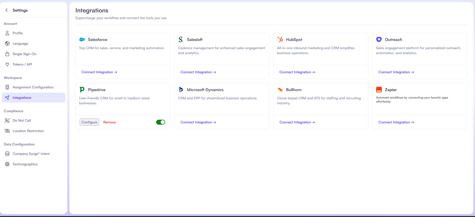 - In Cognism, click Integrations in the left-hand menu.