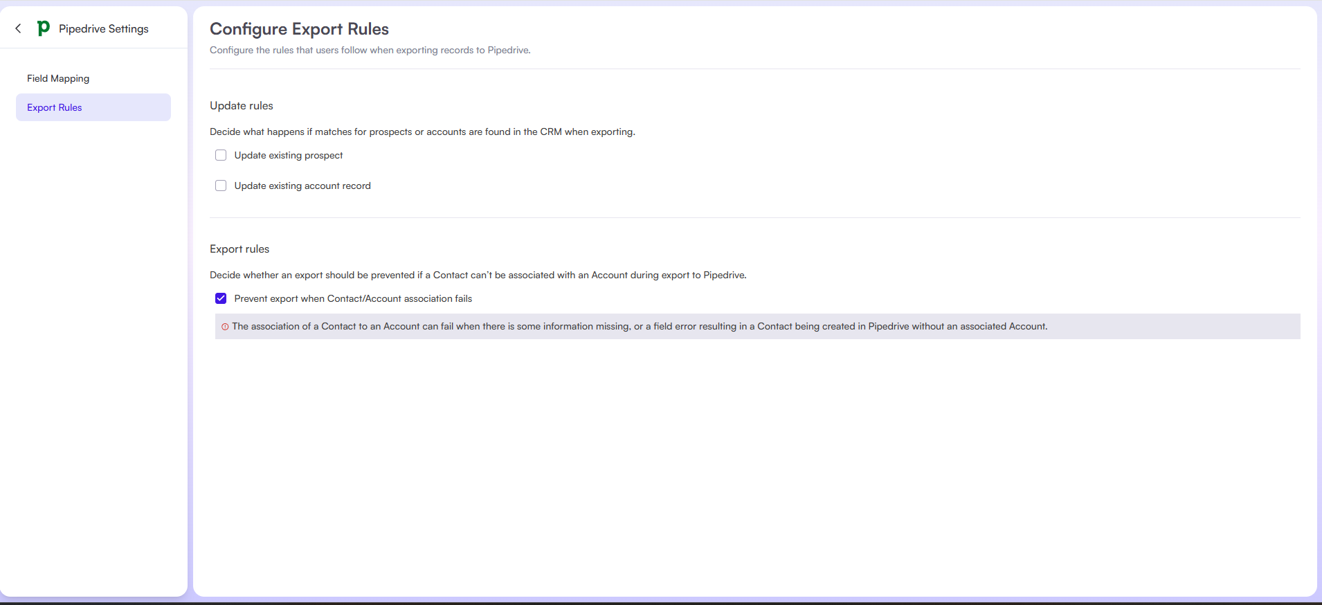 Navigate to Export Rules Tab to set export rules to control how Cognism handles existing records when exporting to Pipedrive.
