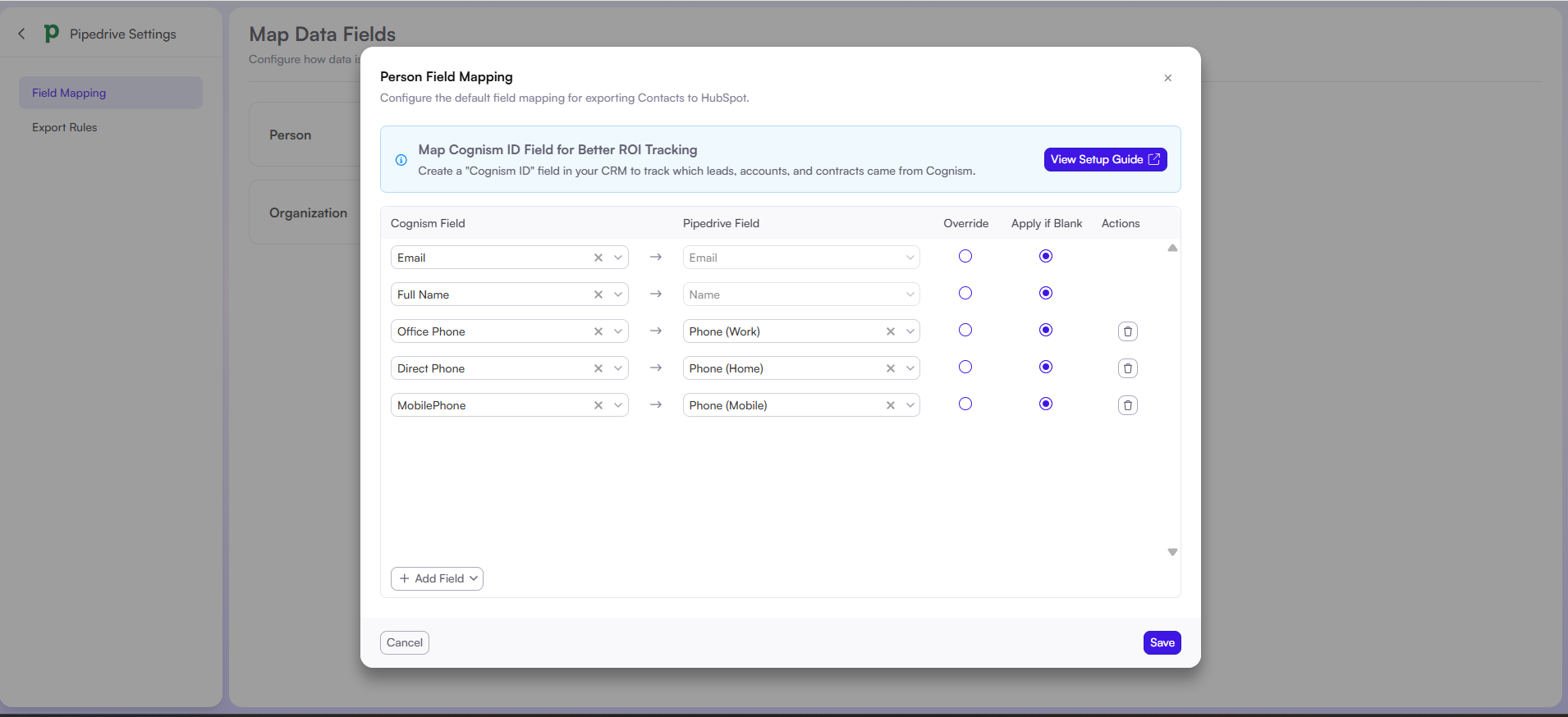 Learn how to set up Pipedrive field mappings in Cognism to control exports, map data accurately, and manage update rules.