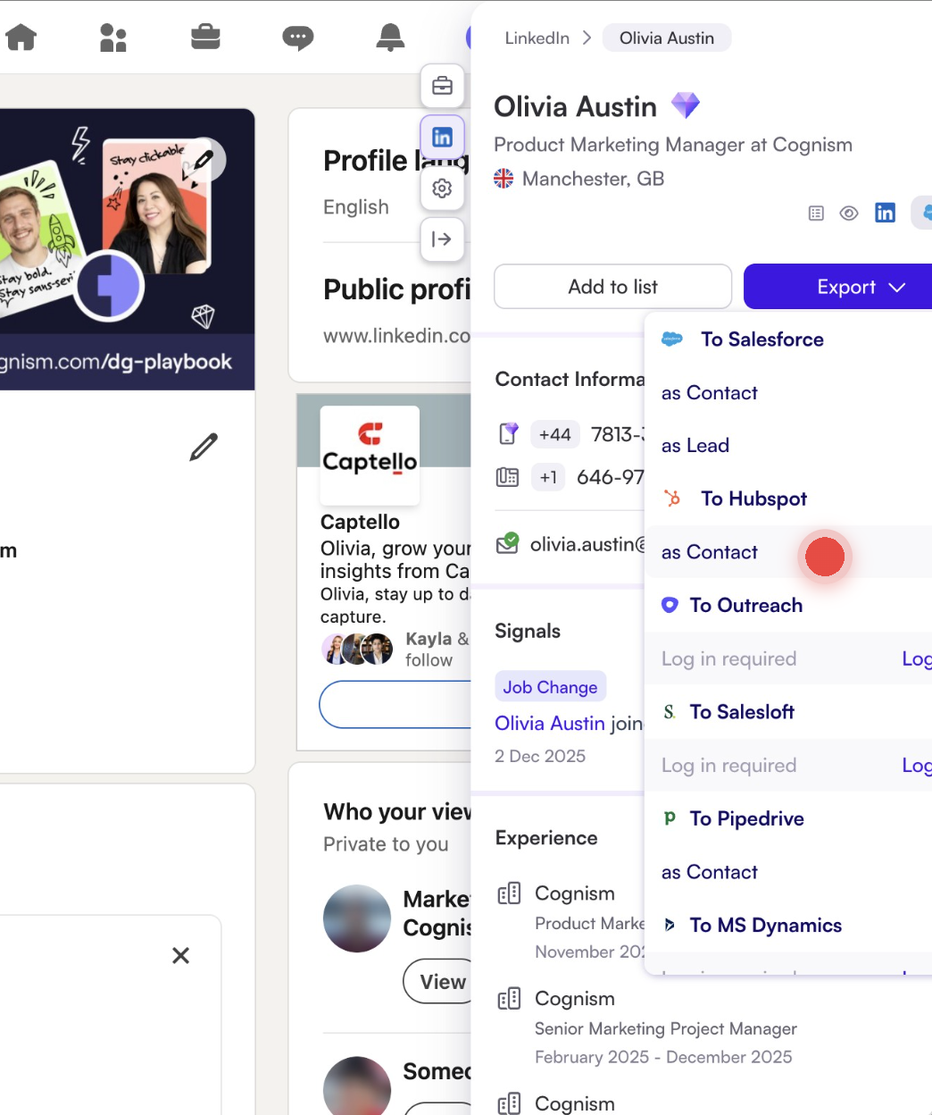 - Open the Cognism Chrome extension on a contact profile.