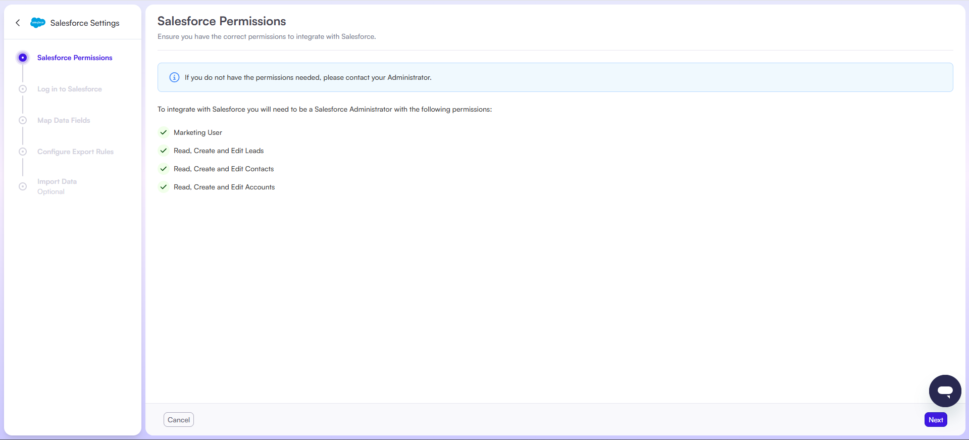 - The admin user setting up the integration must have the following Salesforce permissions: