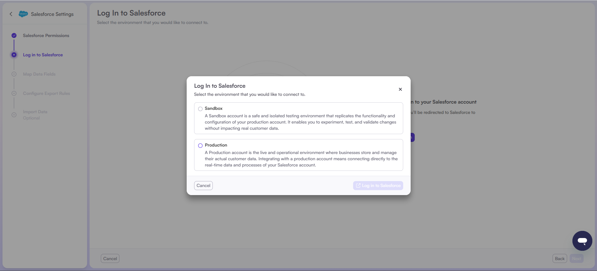 - Select the Salesforce environment you want to connect: