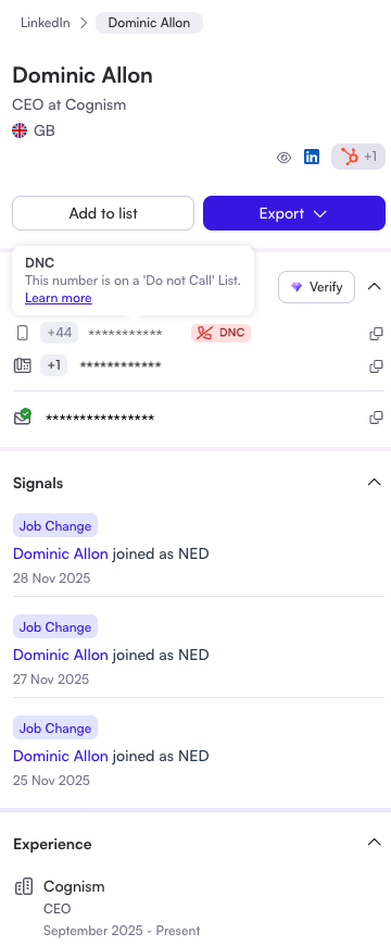 In some cases, users may need to contact prospects outside their own geography or native DNC jurisdiction. Cognism allows admins to control DNC number visibility to support this, while maintaining compliance.