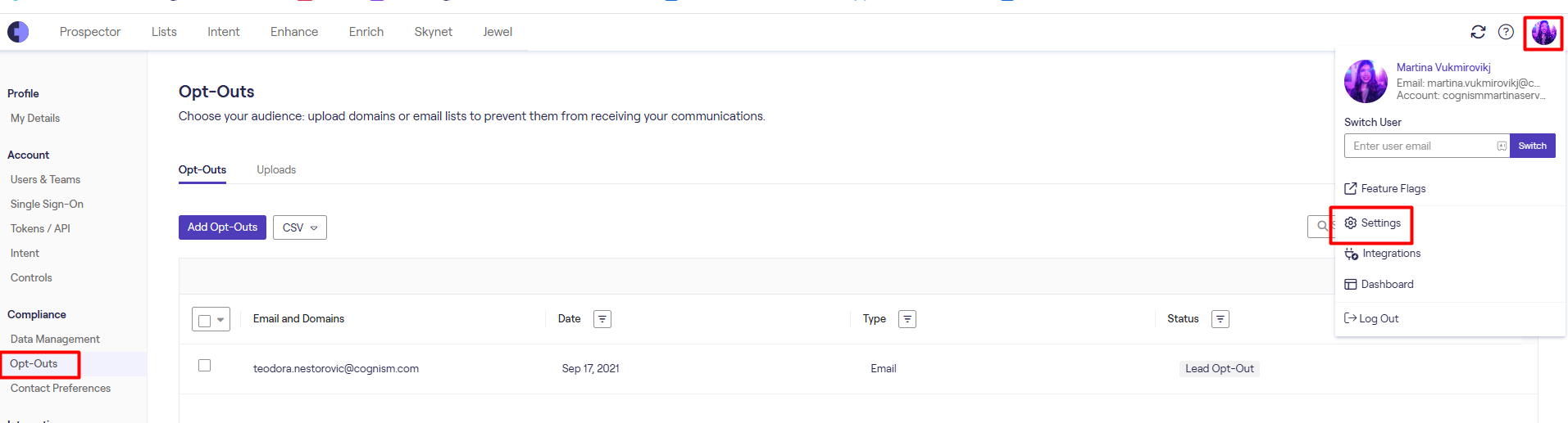 1. Navigate to the Opt-Out section in Settings. (User Avatar > Settings > Opt-Out )