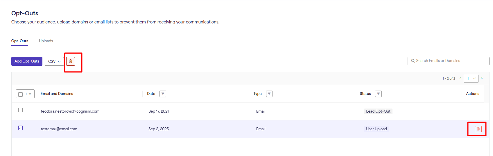 Users can easily remove manually uploaded emails/domains from their Opt-Out list.