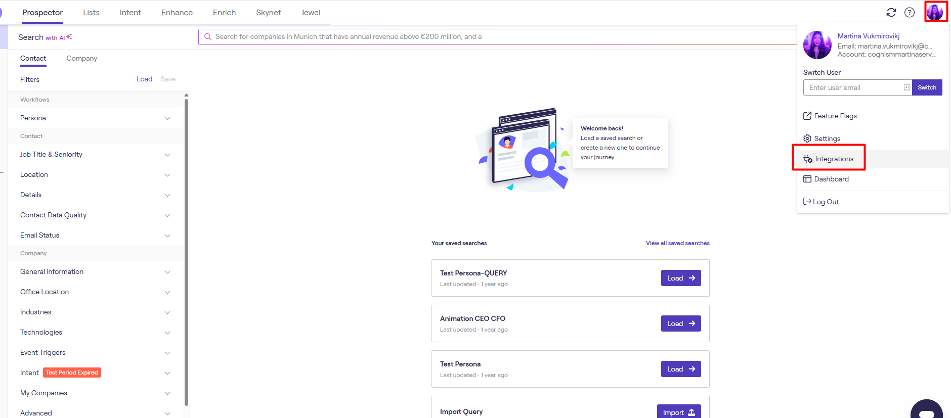As with the configuration of Field Mappings for integrations, the Cognism Admin has to configure these rules. Go to your User Avatar > Integrations.