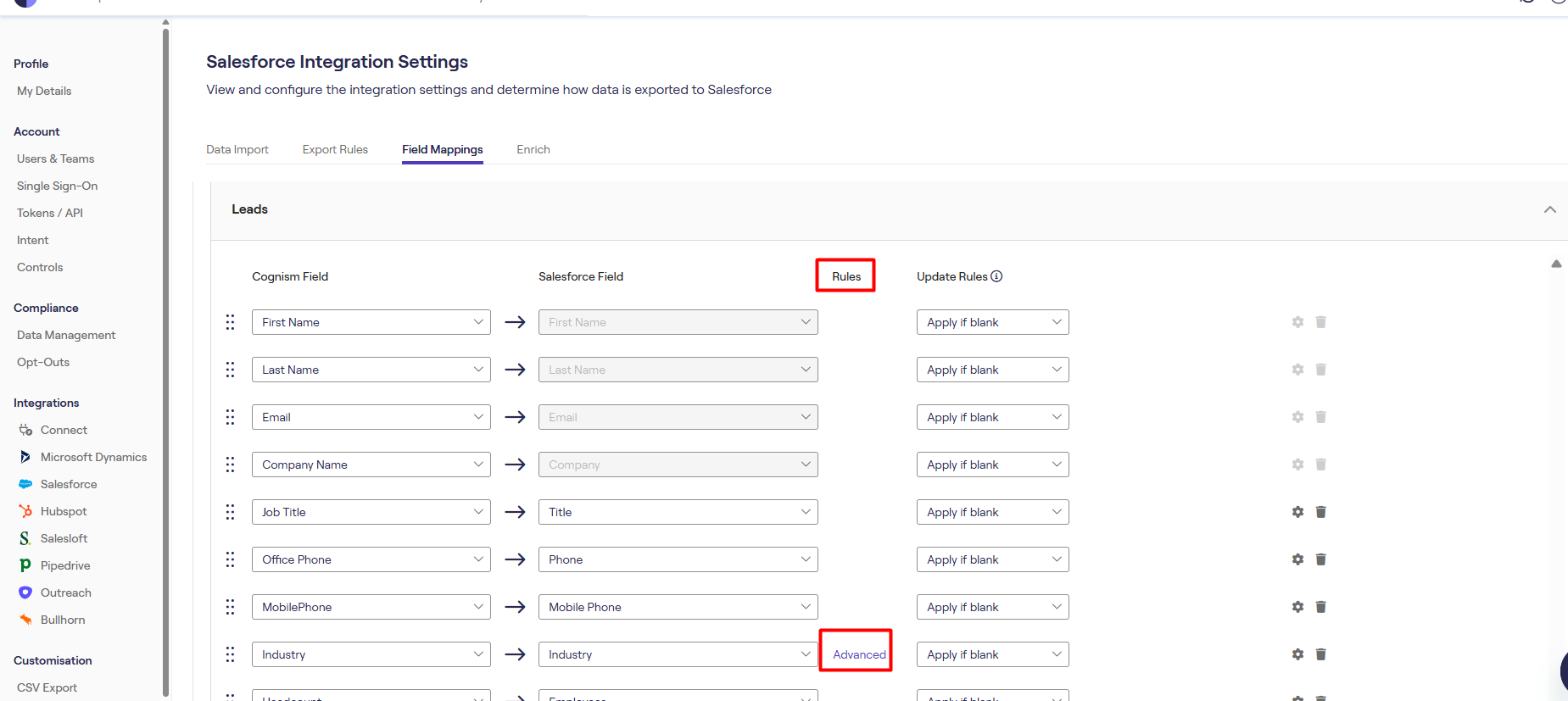 Next to the relevant field, click Advanced and you can select which Cognism fields should be mapped over to your CRM field.